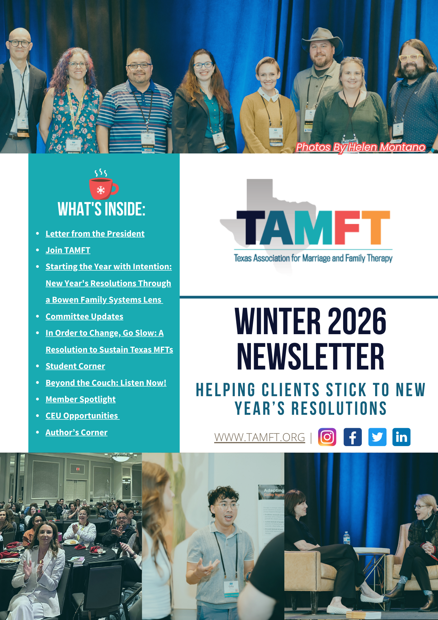 About the Webinar: This webinar explores how intentionally integrating parents into the play therapy process can strengthen therapeutic outcomes for children. Participants will learn the role parents play in play therapy, practical strategies for conducting effective parent-integration sessions, and common challenges clinicians face, along with realistic solutions. Attendees will leave with tangible, immediately applicable skills to confidently support and engage parents in their clinical work. View All CEU Opportunities![]() TAMFT Winter 2026 NewsletterRead the latest issue of the TAMFT newsletter, Helping Clients Stick to New Year's Resolutions, which features updates from our committees, CEU opportunities, member spotlights, and more! Read the Newsletter |